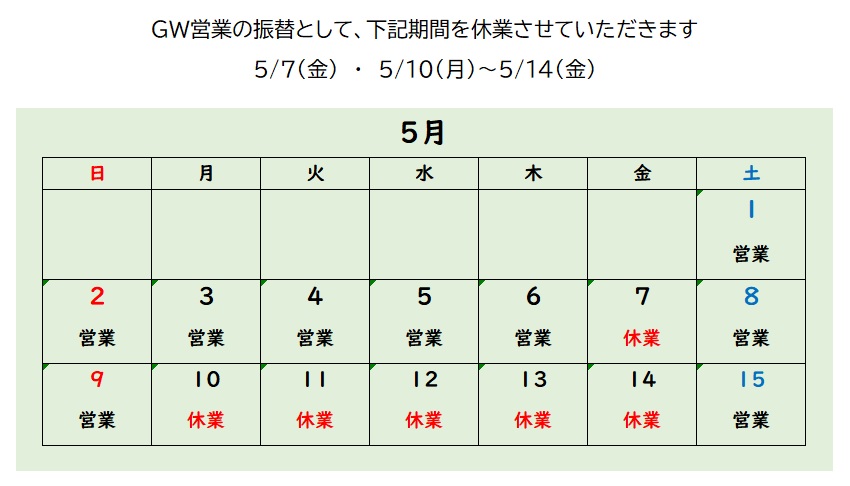 誠に勝手ながら、下記期間をGW営業の振替として休業させていただきます。 ■5月7日(金) ■5月10日(月)〜14日(金) 皆様にはご不便をお掛けいたしますが、何卒ご理解を賜りますようお願い申し上げます。