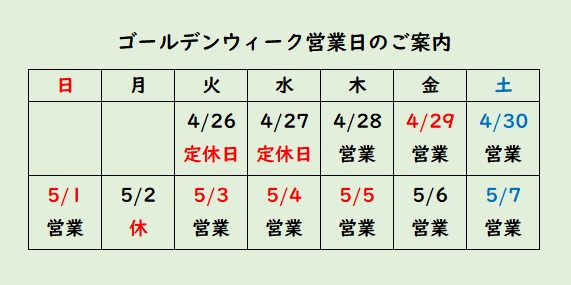 > ゴールデンウィーク営業日のご案内
